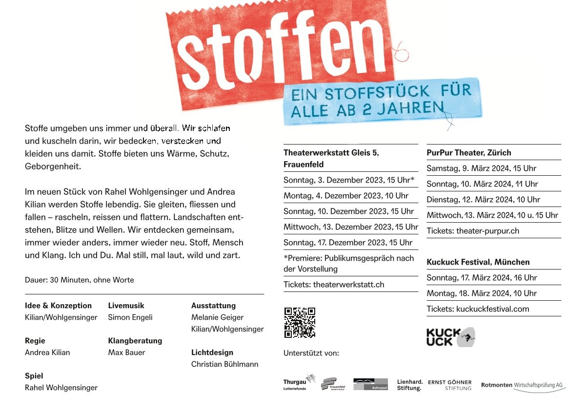 Im neuen Stück von Kilian/Wohlgensinger werden Stoffe lebendig. Sie gleiten, fließen und fallen – rascheln, reißen und flattern. Landschaften entstehen, Blitze und Wellen. Wir entdecken gemeinsam, immer wieder anders, immer wieder neu. Stoff, Mensch und Klang. Ich und Du. Mal still, mal laut, wild und zart.